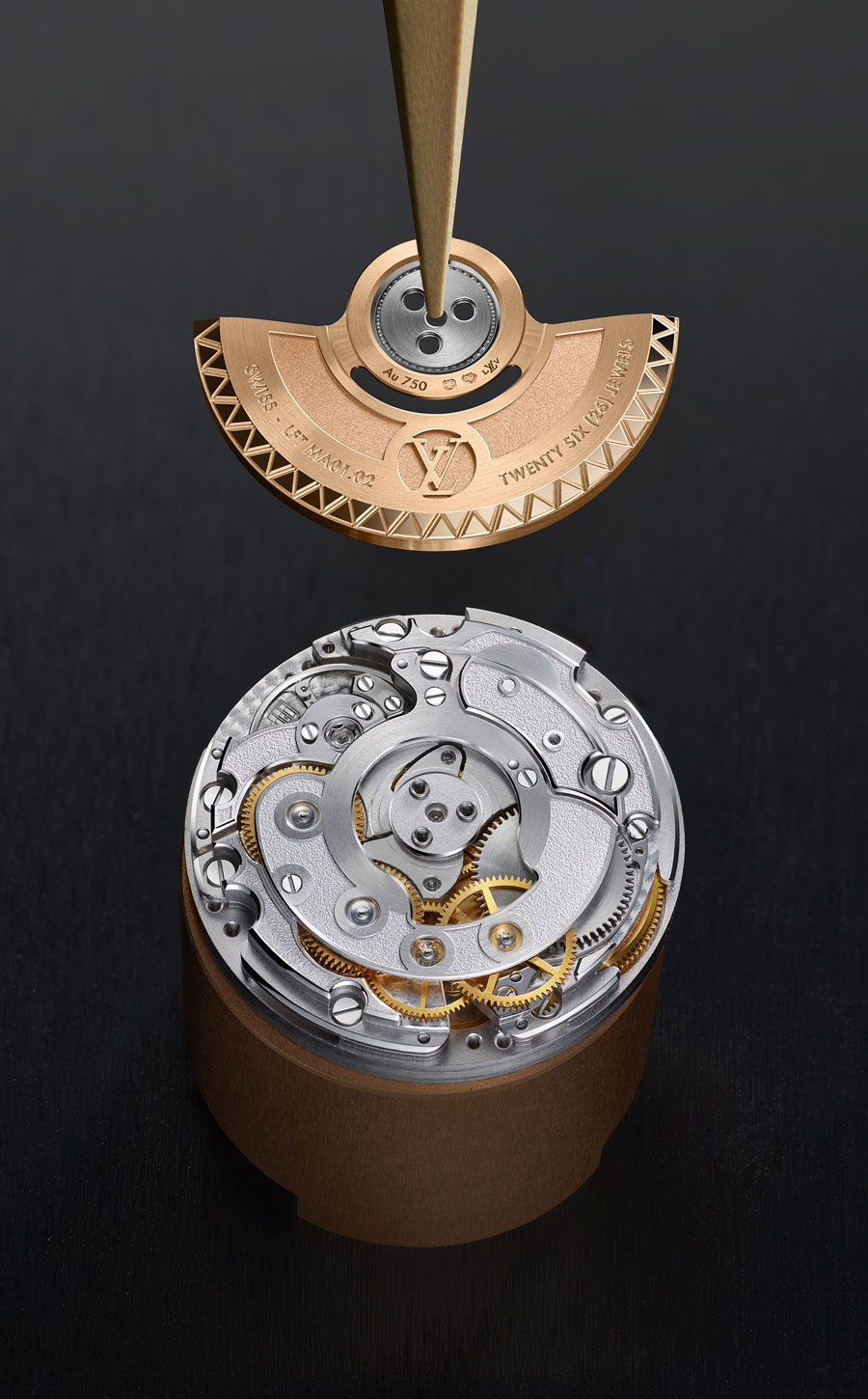 Sous le fond plein bat un calibre automatique développé et décoré par La Fabrique du Temps. Oscillant à une fréquence de 28 000 alternances /heure (soit 4 Hz), il est doté d’une réserve de marche d’environ 45 heures et arbore une masse oscillante en or rose 18 carats, bordé d’une multitude de V stylisés ajourés, un motif évoquant le Monogram de Louis Vuitton.
