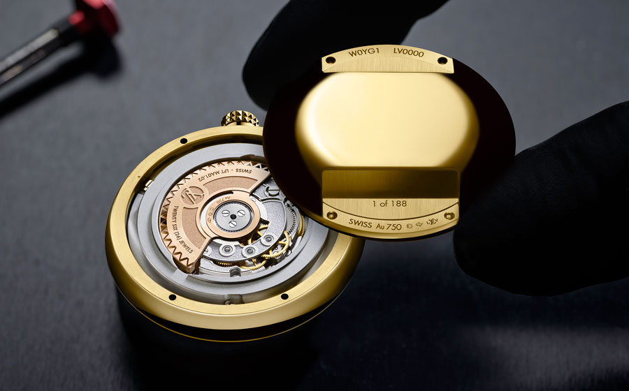 Le mécanisme est aussi muni du Poinçon La Fabrique du Temps Louis Vuitton sur le balancier, d’une platine perlée, de ponts sablés et de bords microbillés, invisibles, mais traités avec le même soin qu’un mouvement à fond transparent. Ce choix de fermer le fond n’est pas une contrainte, mais une affirmation esthétique : seuls les connaisseurs et 188 propriétaires de cette pièce savent ce qui se cache derrière…