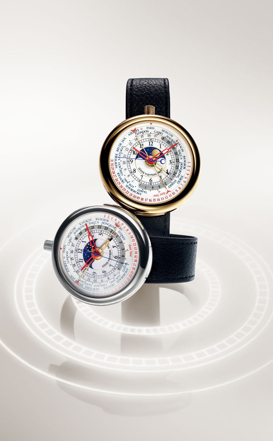 Résultat : deux montres radicales, LV I et LV II, sans cornes, galet poli, couronne positionnée à 12 h en hommage aux montres de poche, et utilisation pionnière de la céramique noire ou verte. Avec complication GMT, heure universelle et alarme, elles dépassaient largement l’accessoire de mode pour s’inscrire dans le langage fonctionnel et cosmopolite de Louis Vuitton : le voyage. Baptisées « Monterey » par un clin d’œil phonétique au mot « montre » à l’américaine, elles sont rapidement devenues des pièces recherchées par les collectionneurs avertis.