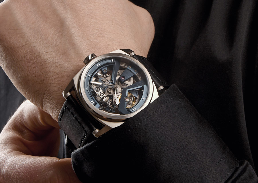 Le résultat est une série de six instruments squelettés en titane dont la finition et l’assemblage sont réalisés à la main. Associés à un bracelet en cuir, ils sont animés par un mouvement à remontage automatique dont 90 % de la valeur provient de Suisse (60 % pour un modèle Swiss Made). Visible côté face et côté fond à travers des verres saphir, celui-ci affiche une grande date au moyen disques transparents et possède une petite prouesse technique exclusive : une masse oscillante périphérique, qui fait l’apanage de très peu de manufactures encore aujourd’hui.