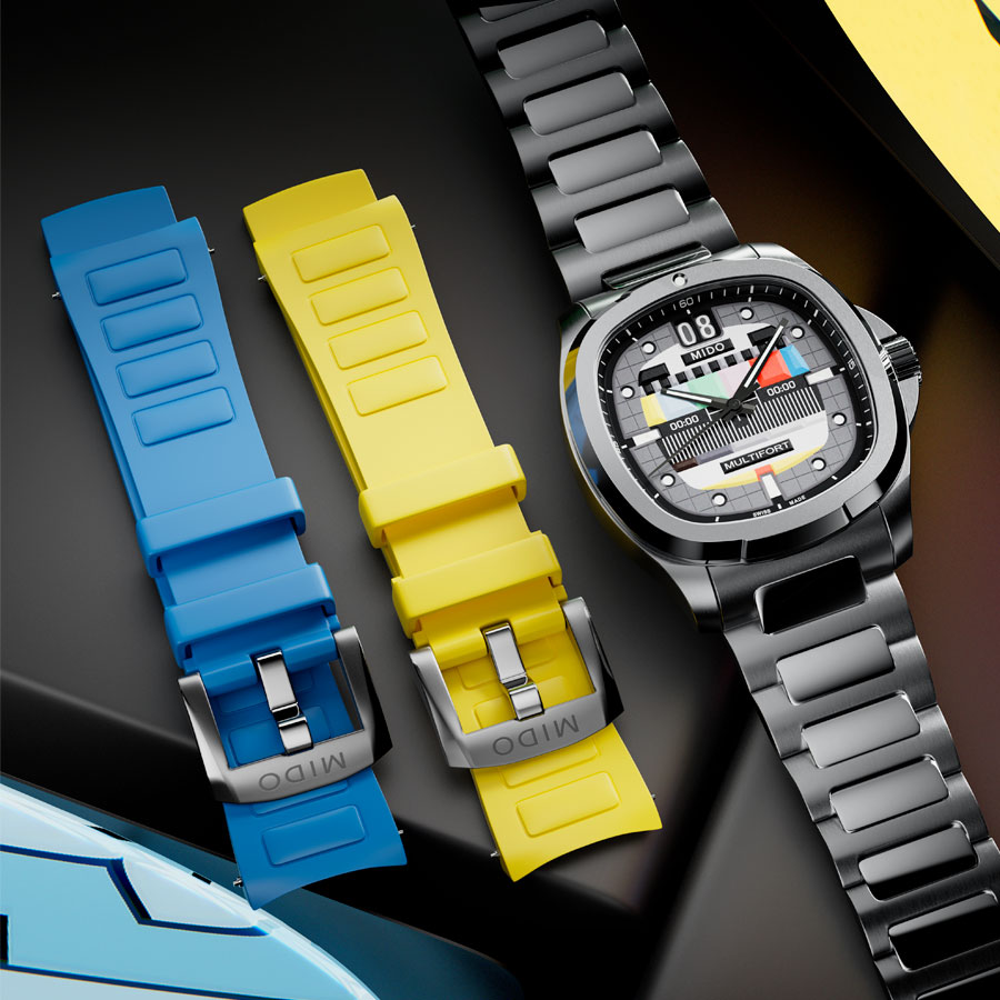 Bracelets additionnels en caoutchouc bleu et jaune avec reliefs. Boucle ardillon satinée en acier inoxydable traitée PVD, avec logo MIDO gravé. Barrettes à ergot pour un changement rapide.