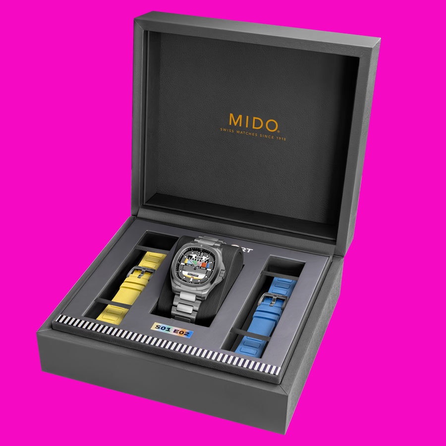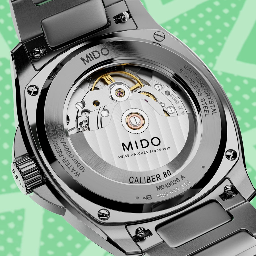 Côté mécanique, le Calibre 80 automatique cadence l’intrigue avec une réserve de marche – comme son nom l’indique – d’environ 80 heures. De plus, son spiral en Nivachron™ assure une forte résistance aux champs magnétiques et aux chocs. Étanche à 100 mètres, la montre se découvre côté coulisses grâce à son fond transparent, laissant apparaître sa masse oscillante décorée de Côtes de Genève et gravée du logo Mido.