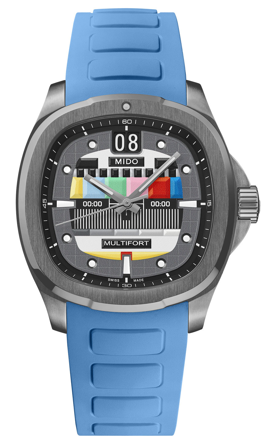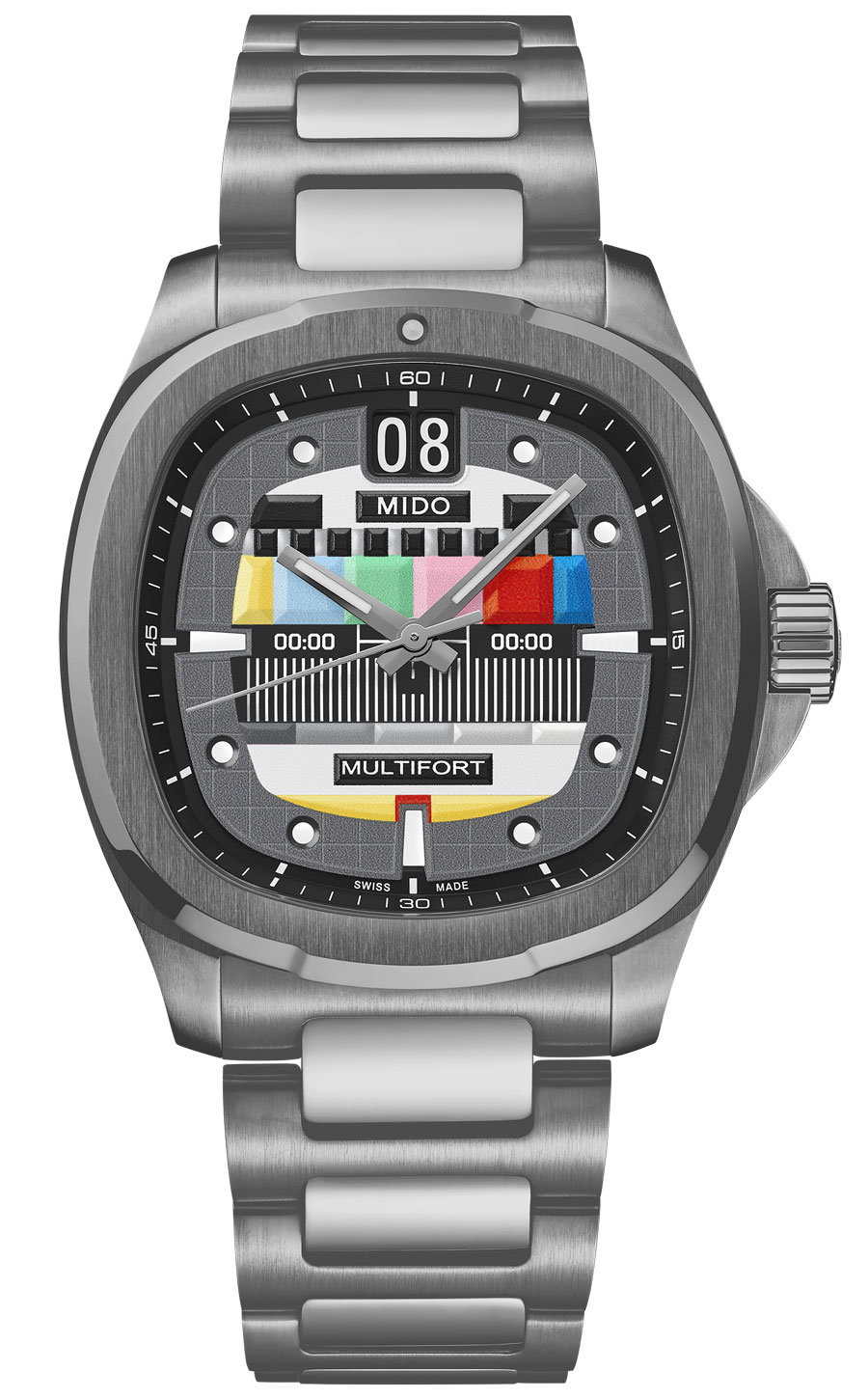 Multicolore sur fond gris, design de télévision vintage en relief positif, index en négatif garnis de Super-LumiNova®.