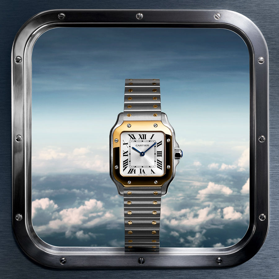 Dans un format de 27 × 34,5 mm pour 7,08 mm d’épaisseur, la montre condense tout ce qui fait l’ADN de la Santos : lunette carrée ponctuée de vis, angles subtilement arrondis, bracelet intégré et cadran signature aux chiffres romains parcourus d’un chemin de fer. Une silhouette immédiatement identifiable. S’inscrivant dans la mouvance des « mini-montres », ce modèle privilégie le mouvement à quartz pour offrir finesse et précision.