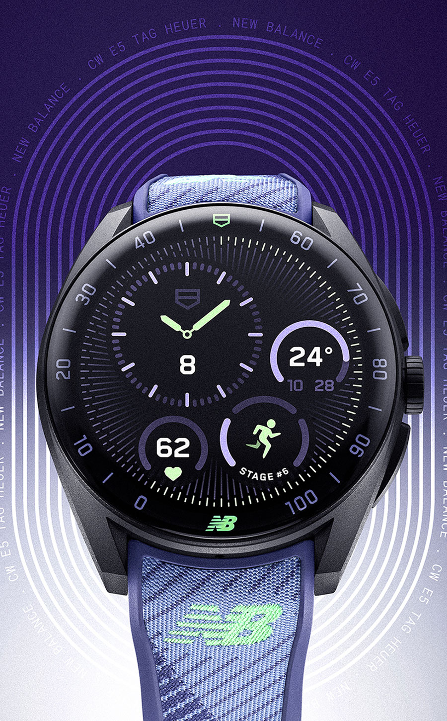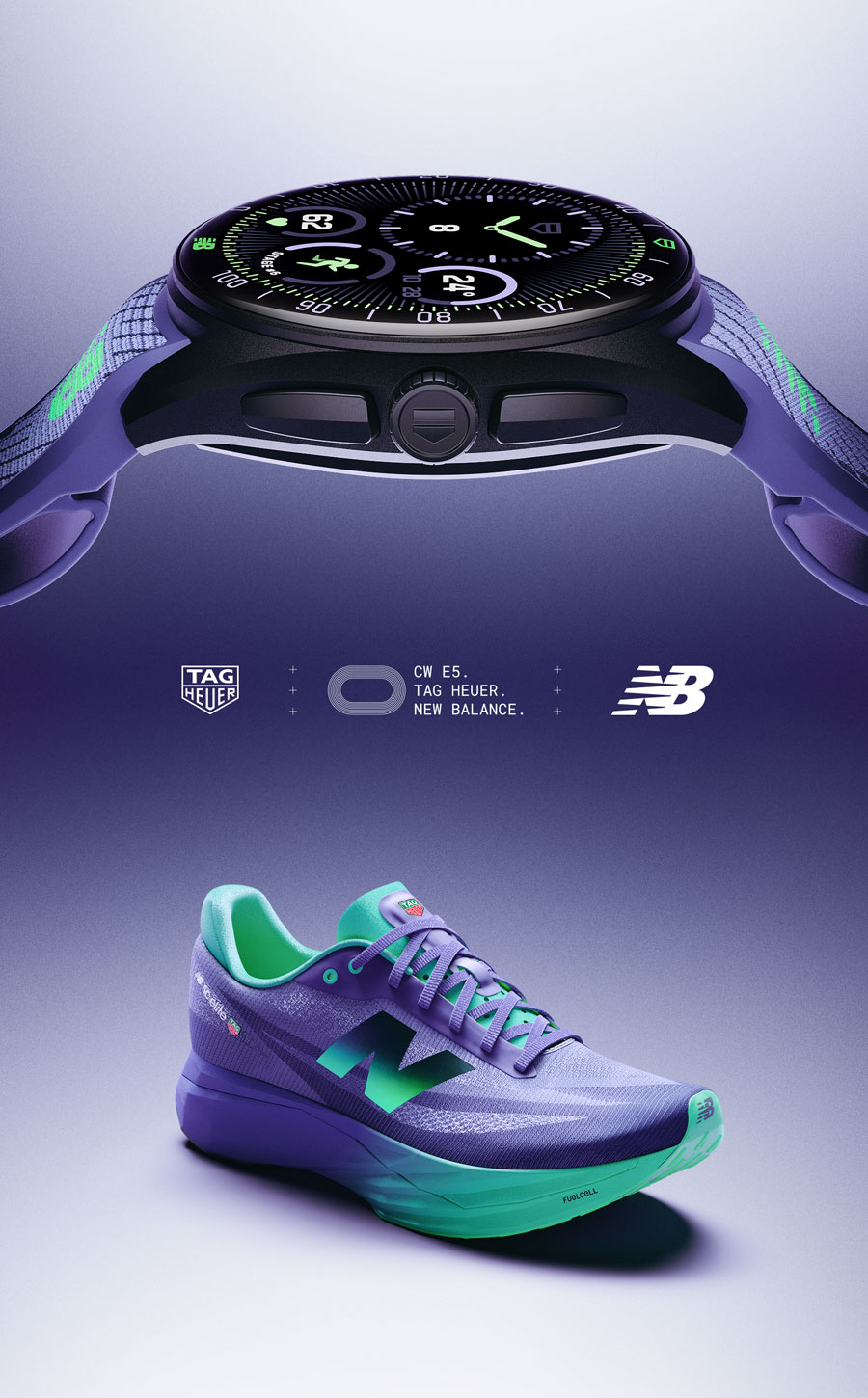 Le cadran inaugure une échelle inédite de 0 à 100 synchronisée avec les données d’entraînement de l’application, offrant un feedback instantané sur les performances. TAG Heuer pousse la collaboration jusqu’au bracelet avec le « Cushion Comfort System », une innovation brevetée mêlant base en caoutchouc souple et textile technique inspiré de l’insert de chaussure : un savant cocktail de robustesse, style et confort. La montre est livrée avec un second bracelet orné d’un logo brodé et pensé pour un maintien renforcé pendant les séances intensives. Côté style, impossible de passer à côté du violet profond English Purple, parfaitement assorti aux New Balance FuelCell SuperComp Elite v5, des chaussures de course ultralégères dotées d’une plaque carbone et d’une semelle intermédiaire en PEBA réactive. L’équipement idéal pour celles et ceux qui visent la victoire — à la seconde près.