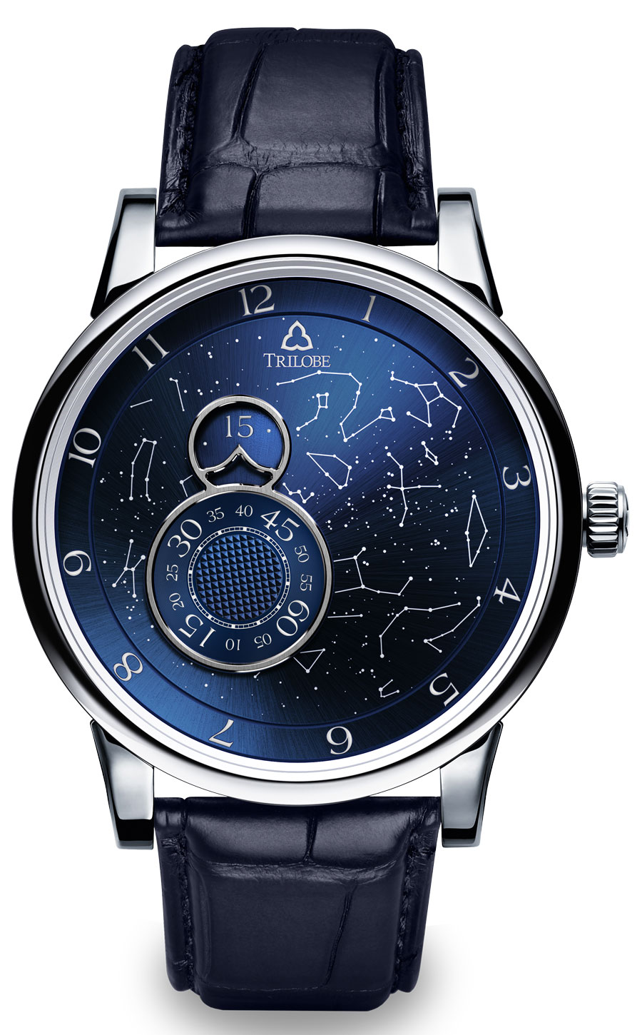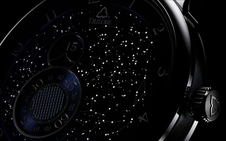 Avec la Nuit Fantastique Secret, Trilobe intègre un dispositif inédit : un cadran entièrement personnalisé, reproduisant la carte du ciel correspondant à une date, un lieu et une heure choisis par le futur propriétaire. Cette représentation astronomique est générée grâce à un algorithme comprenant 1600 constellations, fondé sur les travaux de Jean Meeus dans Calculs astronomiques à l’usage des amateurs. Capable de restituer un ciel passé comme futur, il garantit à chaque montre une signature véritablement unique. L’affichage se révèle encore plus spectaculaire à la nuit tombée. Après exposition à une lumière UV, les étoiles tampographiées s’illuminent, créant une lecture nocturne où les constellations s’animent sous le verre saphir.