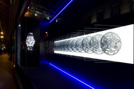 Pour la première fois en France, la maison Piaget expose son tout dernier record du monde dans une vitrine de 7m de longueur. La montre Altiplano Squelette Automatique extra-plate, résolument inscrite dans la génétique de la marque et ovationnée par la presse lors du dernier SIHH, affiche l’extrême finesse de son mouvement squelette automatique le plus plat du monde (2.40mm) sur 16 panneaux en verre en 60cmx60cm.