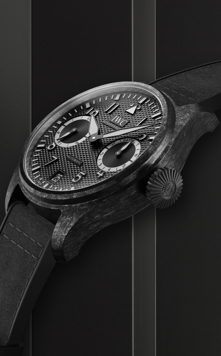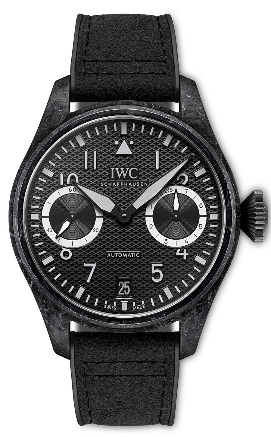 Première montre d’IWC à être équipée d’un boîtier en composite à matrice céramique (CMC), la Grande Montre d’Aviateur AMG G 63 dispose d’un indicateur de réserve de marche situé dans un compteur à 3 heures.