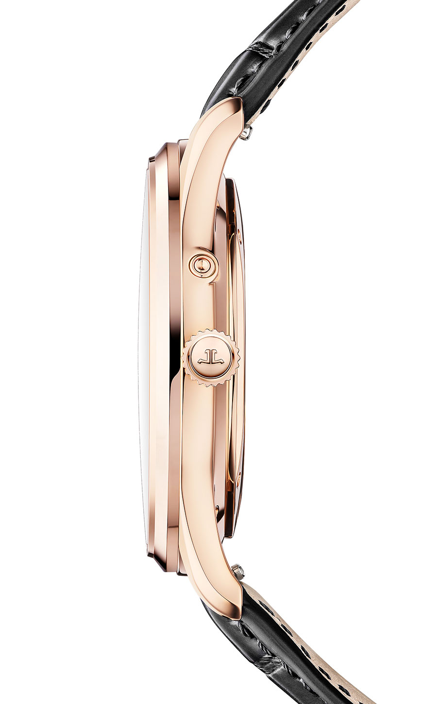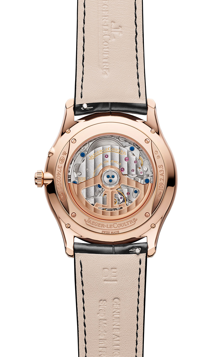 Aujourd’hui, avec la Master Ultra Thin Power Reserve, il prend la forme d’une jauge, se place entre 9 h et 11 h et affiche environ 70 heures d’autonomie. Il partage le cadran beige coquille d’œuf avec une petite seconde (à 6 h) et une date à aiguille (entre 1 h et 3 h). Tous ces éléments n’empêchent en aucun cas la finesse de l’ensemble, bien au contraire, et il affiche 8,95 mm d’épaisseur. Au verso du boîtier de 39 mm de diamètre en or rose, le calibre automatique dévoile, à travers un fond en saphir, ses moindres rouages minutieusement décorés, dont une masse oscillante ajourée en or rose.