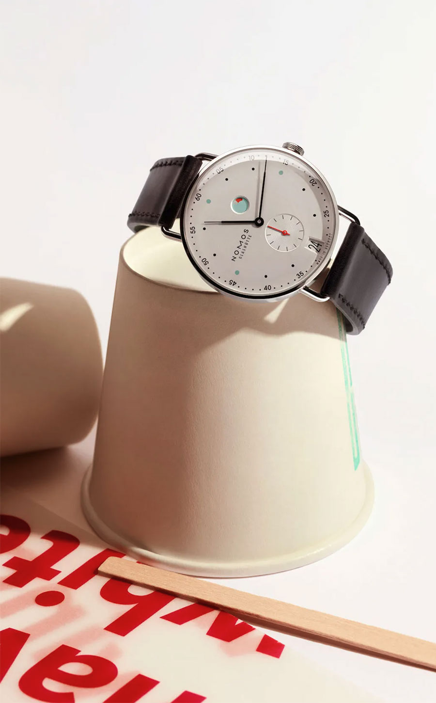 Avec la Metro Date Réserve de marche, Nomos Glashütte signe une pièce de designer. Derrière ses lignes épurées et ses détails graphiques se cache une belle mécanique, dont la réserve de marche constitue l’un des arguments majeurs. Présentant un boîtier en acier de 37 mm de diamètre pour seulement 7,7 mm d’épaisseur, la montre séduit d’abord par sa finesse. Le cadran galvanisé, plaqué argent blanc, met en valeur des aiguilles brunies à chaud, aussi fines que des extrémités de plume, ponctué d’accents colorés rouge et vert menthe. La trotteuse rouge apporte une touche dynamique, tandis que l’affichage de la date dans un large guichet, évoque son ADN saxon (la Date Panorama de Glashütte Original ou encore la Grande Date de A. Lange & Söhne).