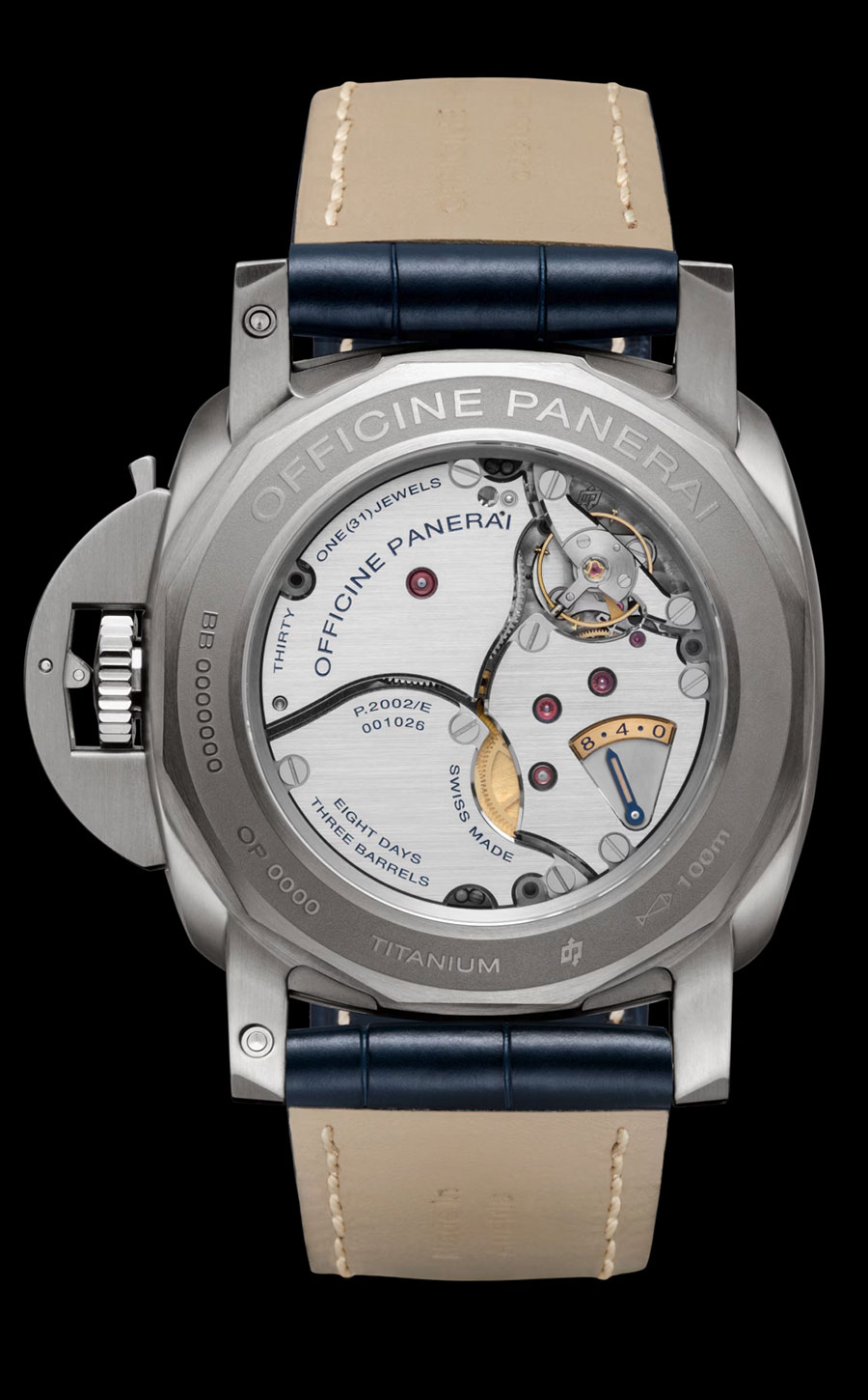 La montre est entraînée par un mouvement à remontage manuel entièrement développé et assemblé à la manufacture Panerai. Composé de 329 éléments et animé par trois barillets, il garantit une autonomie exceptionnelle de 192 heures.