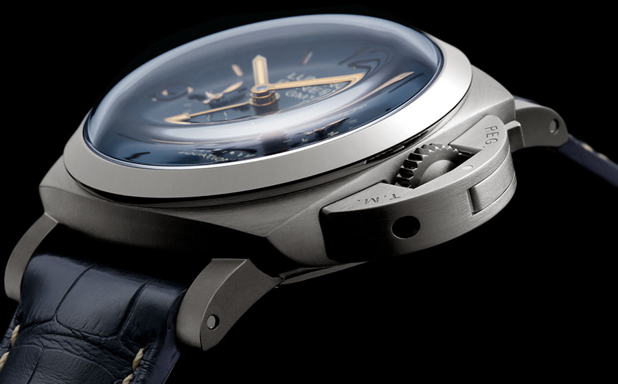 Derrière le design emblématique du modèle Luminor 1950 Equation of Time 8 Days GMT — boîtier de 47 mm en titane satiné, pont protège-couronne à levier et cadran sandwich bleu soleillé — se cache un concentré de complications utiles, combiné à une réserve de marche de huit jours. Son indicateur, visible au dos à travers le fond saphir, permet de contrôler avec exactitude l’énergie restante.