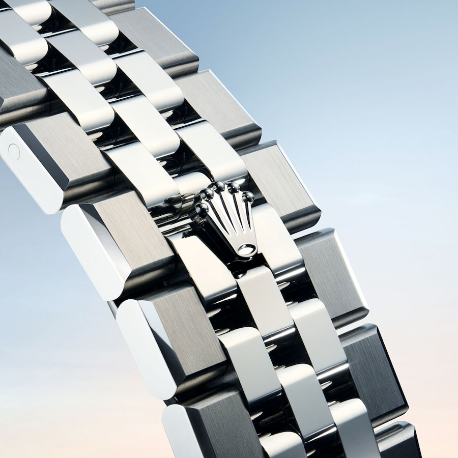 Les chanfreins des extrémités supérieures des mailles de bord, quant à eux, sont polis et forment ainsi une ligne de lumière sans interruption de part et d’autre de la boîte. Le bracelet est aussi pourvu d’un fermoir invisible Crownclasp, orné du logo à la couronne. Pour la première fois, des inserts en céramique renforcent la longévité de la barrette de fixation.