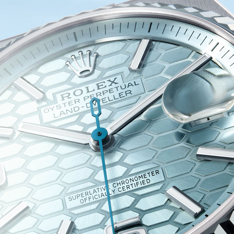 Consulter la fiche technique de la Rolex Land-Dweller en platine et cadran bleu – 64 200 euros