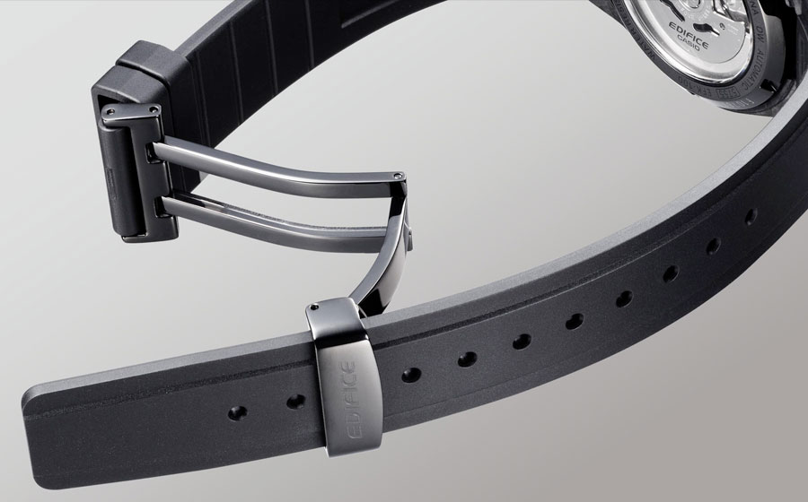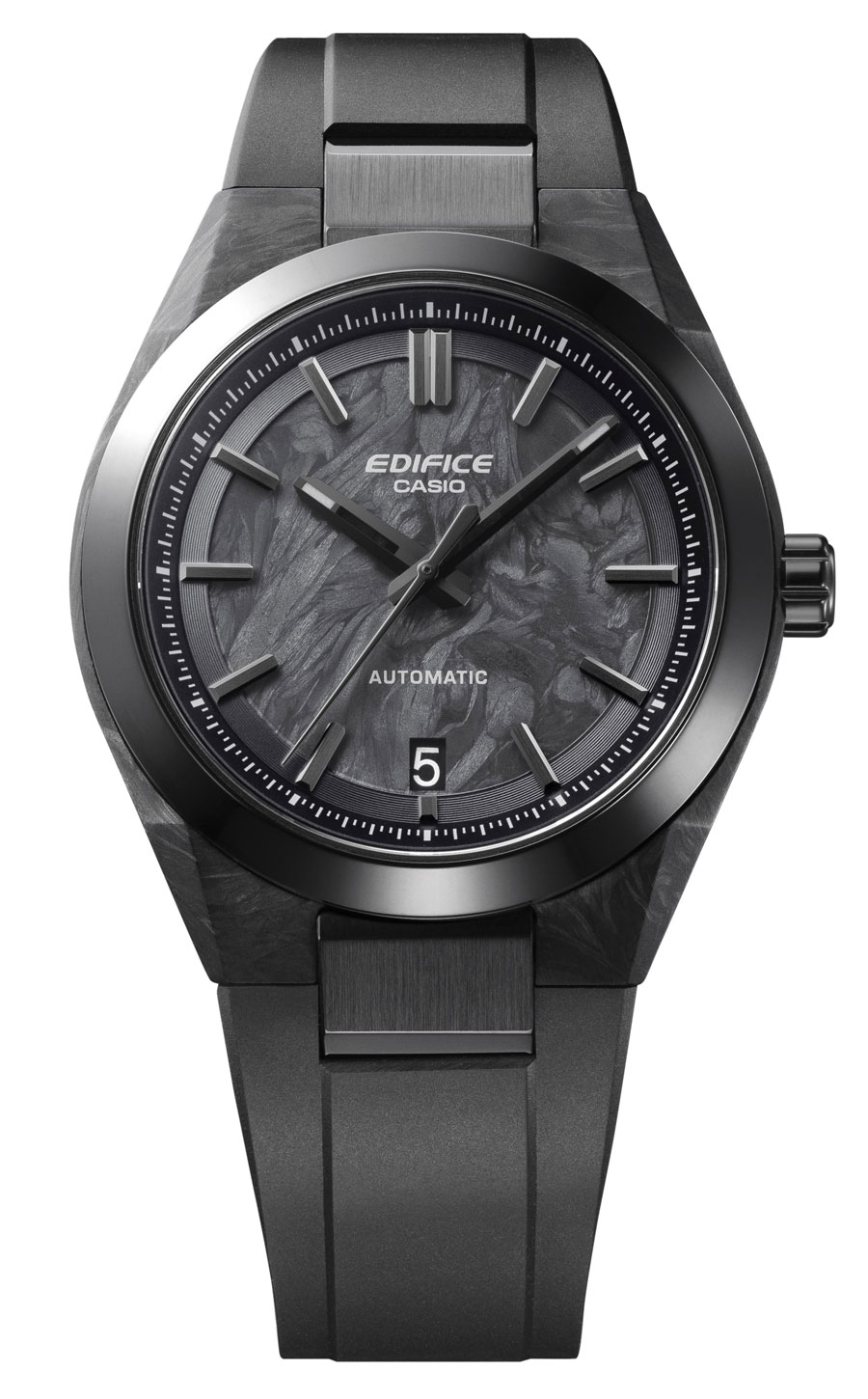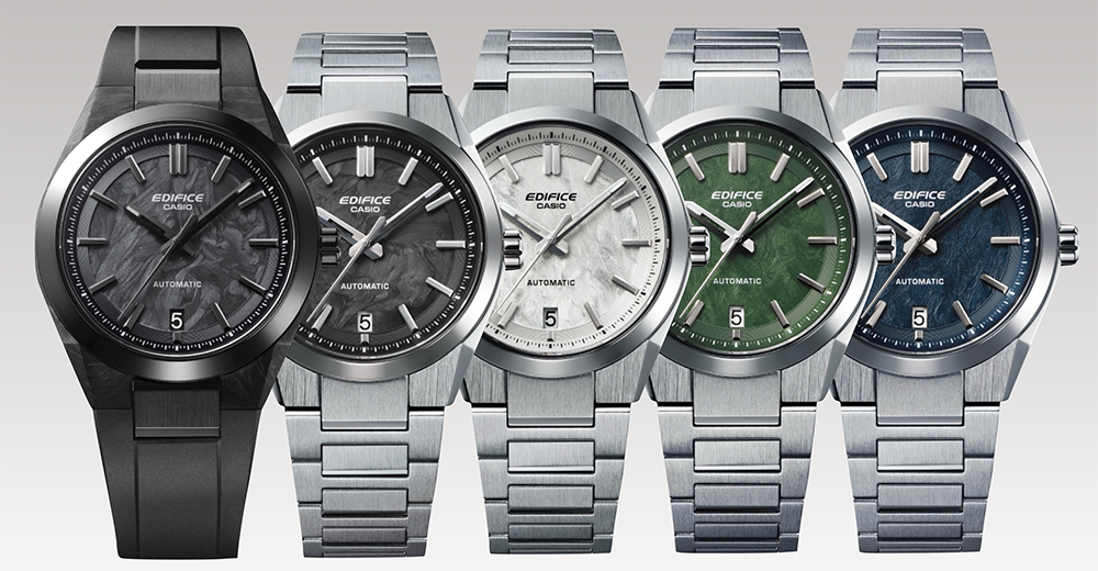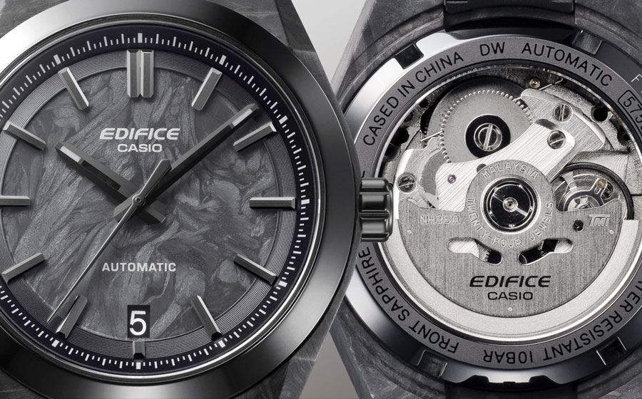 La marque dévoile au total cinq références automatiques, toutes animées par un mouvement mécanique offrant 40 heures de réserve de marche. Le fond transparent — un petit plaisir horloger que Casio ne s’était encore jamais offert — dévoile des rouages en action façon moteur miniature. La EFK-100CD possède un cadran en carbone forgé, mais en version acier avec différentes finitions : brossage, polissage miroir, éclat métallique… une vraie carrosserie premium pour le poignet. Trois autres déclinaisons colorées (vert, bleu, blanc) complètent la grille de départ, reproduisant la texture du carbone grâce à l’électroformage, une technique digne d’un atelier de haute précision.