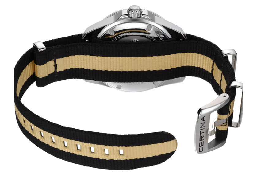 Certina n’a pas négligé le confort : avec un diamètre de 40,5 mm, une hauteur de 14,10 mm et un entre-corne de 20 mm, la montre s’adapte à tous les poignets. Le bracelet NATO, initialement conçu pour l’armée, complète cette robustesse avec une résistance exemplaire aux déchirures et à l’humidité, tout en conservant une esthétique sobre et polyvalente.