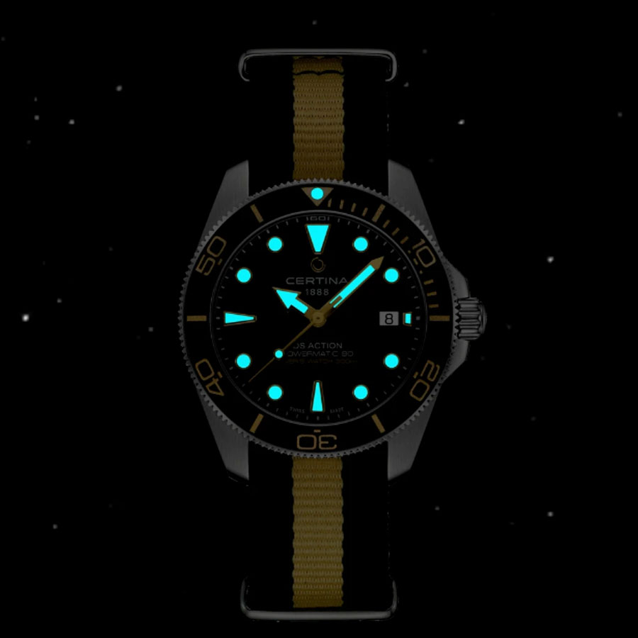 Ce modèle marque une étape importante pour la Maison : c’est en effet la première montre à intégrer le New DS Concept – Extreme Shock Resistance, une évolution majeure du célèbre système de protection Certina. Conçu pour absorber les chocs les plus rudes, ce dispositif renforce la durabilité de la montre déjà usinée en acier 316L, matériau reconnu pour sa résistance à la corrosion, essentielle dans un contexte marin. La lunette en céramique offre une grande résistance aux rayures tout en apportant une finition élégante. Les aiguilles et les index sont recouverts de Super-LumiNova BG W9, garantissant une lisibilité parfaite en eaux sombres grâce à une lueur bleutée durable. Sous le verre saphir traité antireflet, la montre abrite le calibre Powermatic 80 : un mouvement automatique suisse offrant une réserve de marche confortable de 80 heures. Doté d’un spiral Nivachron, il est insensible aux champs magnétiques.