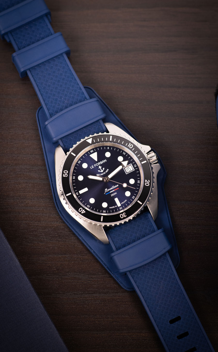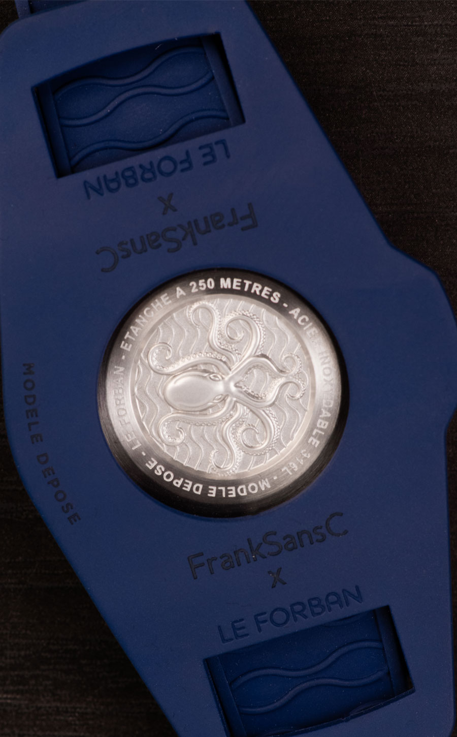 Nouvelle collab’ pour Frank Sans C qui dévoile une interprétation du modèle « Marseillaise » de la marque horlogère Le Forban Sécurité Mer. Protégé par un verre saphir plat, cette édition de 40 mm en acier 316L poli-brossé aux couleurs du toqué du tic-tac possède un cadran bleu marine soleillé signé « Made in Frank », associé à un nouveau bracelet Dive Bund® bleu marine estampillé « Frank Sans C ».