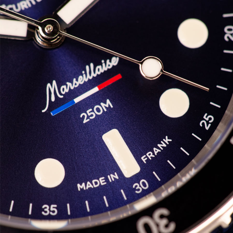 Ce modèle reprend les élément esthétiques et techniques du modèle en collection. Inspirée de la mythique plongeuse « Monnin » de 1979, elle renoue avec l’ADN du garde-temps d’origine tout en bénéficiant d’une mise à niveau technique significative. Son boîtier passe ainsi de 42 à 40,8 mm, son épaisseur est affinée sous la barre des 12 mm et sa longueur corne à corne est fixée à 46 mm, offrant un meilleur confort de poignet sans trahir l’esprit vintage du design initial. Étanche à 250 m – une amélioration notable par rapport aux 200 m de la pièce historique – la Marseillaise adopte tous les codes d’une plongeuse : lunette unidirectionnelle (120 clics), cadran ultra-lisible avec ses aiguilles « flèches », sa trotteuse Lollipop et ses index recouverts de matière luminescente. L’ensemble est animé par un mouvement automatique Sellita SW200 et doté d’environ 38 heures de réserve de marche.