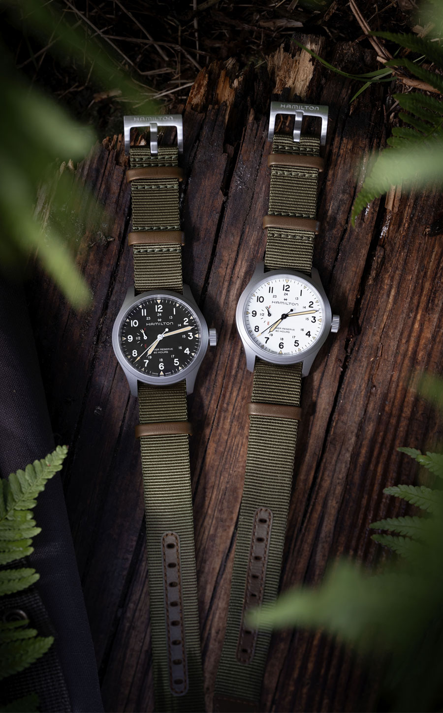 Le boîtier de 40 mm de diamètre adopte une finition sablée. Cadran noir ou blanc, bracelet acier trois rangs avec EasyClick ou NATO vert aux passants en cuir : la montre se prête aussi bien au trekking urbain qu’à une échappée en pleine nature.