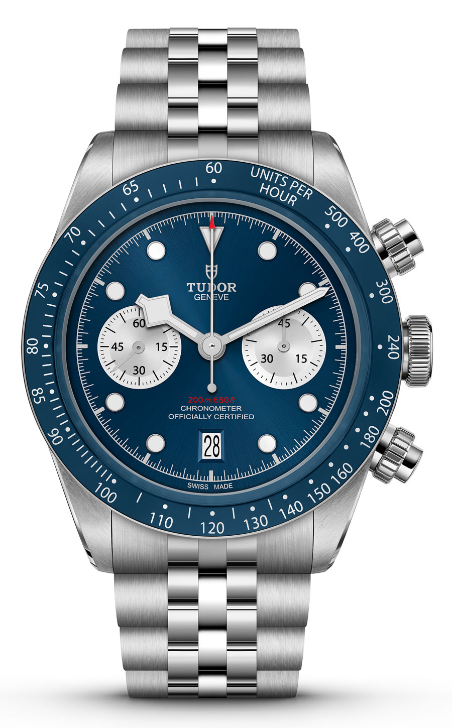 Étanche à 200 mètres, il est pourvu d’une lunette fixe également équipée d’une échelle tachymétrique. De couleur bleue, celle-ci est assortie au cadran bombé à l’effet légèrement satiné et soleillé. Ce dernier est contrasté par deux compteurs argentés azurés (petite seconde à 9 h et compteur 45 minutes du chrono à 3 h), des aiguilles « Snowflake » et des index ronds luminescents, ainsi qu’une date à 6 heures. Grâce à ses cornes biseautées, la chute du bracelet est bien exécutée, conférant une souplesse au porté indéniable.