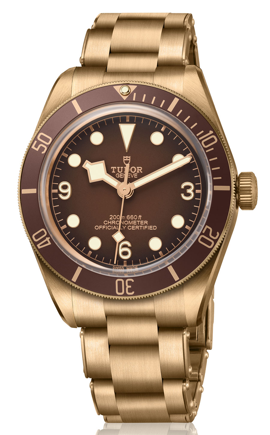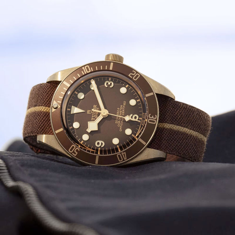 Notons qu’un bracelet additionnel en tissu marron agrémenté d’une bande dorée est livré dans le coffret. Rehaussé d’une lunette tournante unidirectionnelle munie d’un disque en aluminium « marron-bronze », le cadran coordonné est survolé des caractéristiques aiguilles « Snowflake » luminescentes. Elles tiennent la cadence grâce à un calibre automatique de manufacture, certifié chronomètre par le COSC. Équipé d’un rotor en tungstène ajouré, le mouvement est aussi pourvu d’un spiral en silicium amagnétique et offre environ 70 heures de réserve de marche.