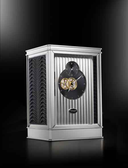 en transparence, derrière cinq panneaux de cristal de roche. Souhaitant porter la beauté esthétique de cette pièce un pas plus loin, Parmigiani Fleurier s’associe à la maison Lalique, fins experts du travail du cristal, pour la production d’une série exclusive et limitée avec un cristal Lalique venant sublimer les contours de la pendulette.