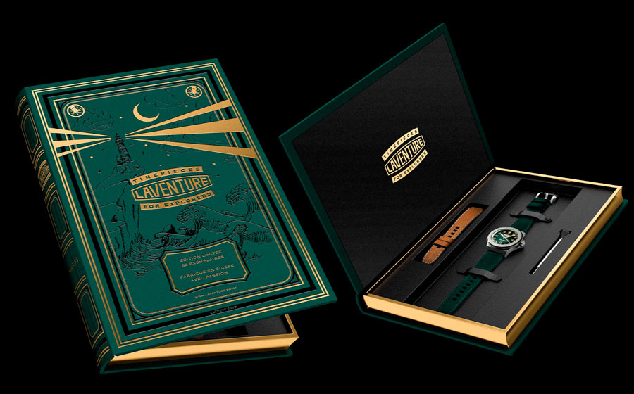 La montre est livrée dans un écrin s’inspirant des anciens livres de Jules Verne : Les Voyages Extraordinaires (Édition Hetzel de la fin XIXe siècle).