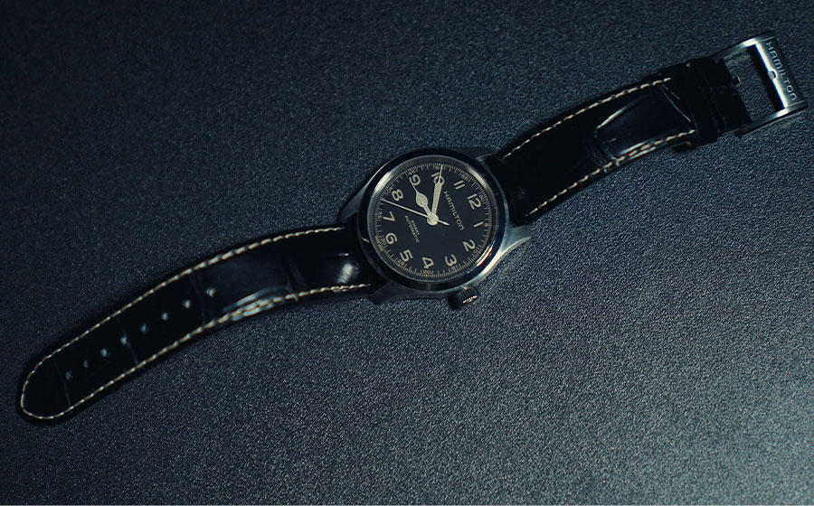 Servi sur un bracelet en cuir noir, le modèle d’Amixem revisite l’ADN originel avec un cadran noir, survolé d’aiguilles nickelées et rehaussées de Super-LumiNova®, qui assurent une lisibilité optimale en toutes circonstances. Côté technique, la Murph reste fidèle à l’exigence Khaki Field. D’une épaisseur de 11,10 mm, son boîtier en acier de 38 mm est étanche jusqu’à 100 mètres. L’instrument est animé par le mouvement automatique H-10, offrant une confortable réserve de marche de 80 heures.