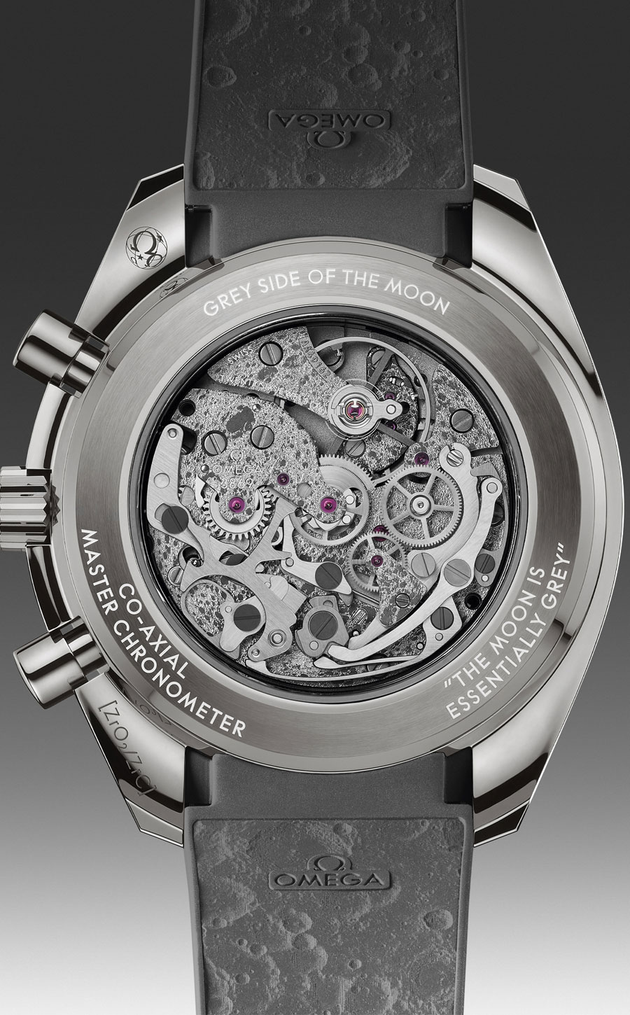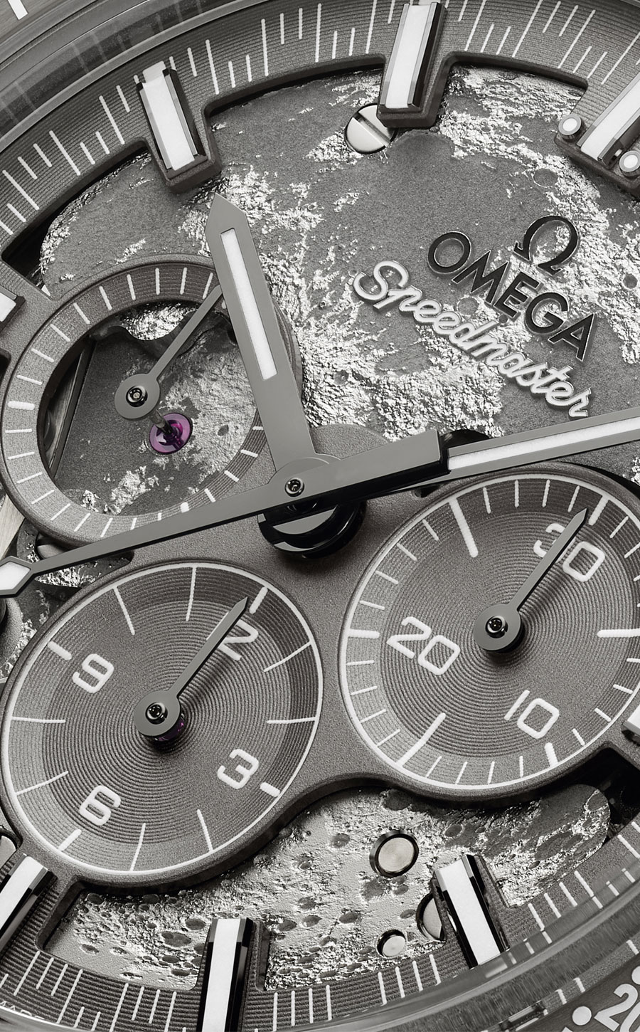 À l’intérieur, Omega déploie son mouvement de chronographe à remontage manuel avec échappement Co-Axial Master Chronometer, gage de précision. Approuvé par l’Institut fédéral de métrologie (METAS), ce calibre, offrant environ 50 heures de réserve de marche, résiste aux champs magnétiques allant jusqu’à 15 000 gauss et il est doté d’un spiral en silicium amagnétique. Enfin, les nouveaux bracelets — nylon doublé de caoutchouc ou caoutchouc texturé façon surface lunaire — rappellent que même dans l’espace, le confort compte…
