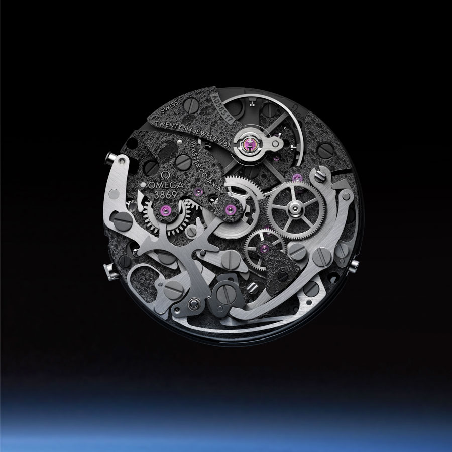 Le Calibre 3869 est décoré d’un relief lunaire, gravé au laser sur la platine et les ponts revêtus de noir.