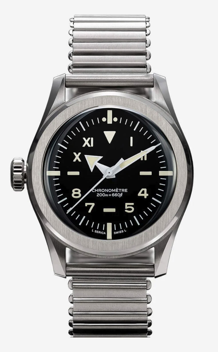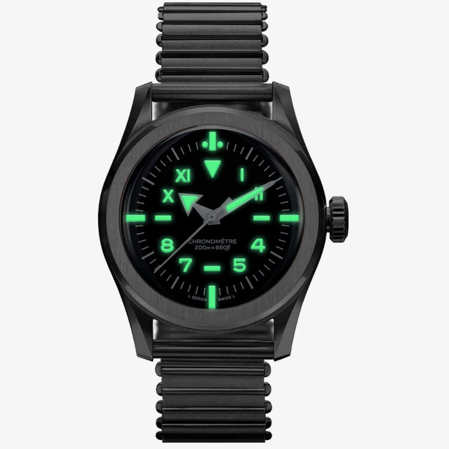 Étanche jusqu’à 200 mètres, il dialogue avec un cadran noir mêlant chiffres romains et arabes en relief, recouverts de matière luminescente de couleur verte. S’inspirant des montres militaires des années 1940, ce modèle résolument vintage est animé par un calibre automatique SoProd, certifié chronomètre par le COSC.