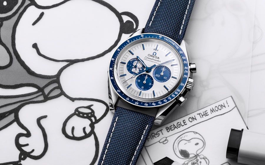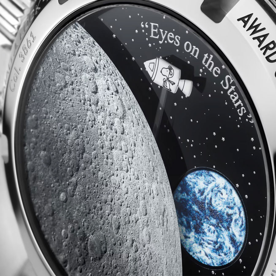 Lorsque l’aiguille des secondes du chronographe est en marche, Snoopy entreprend un voyage autour de la face cachée de la Lune.