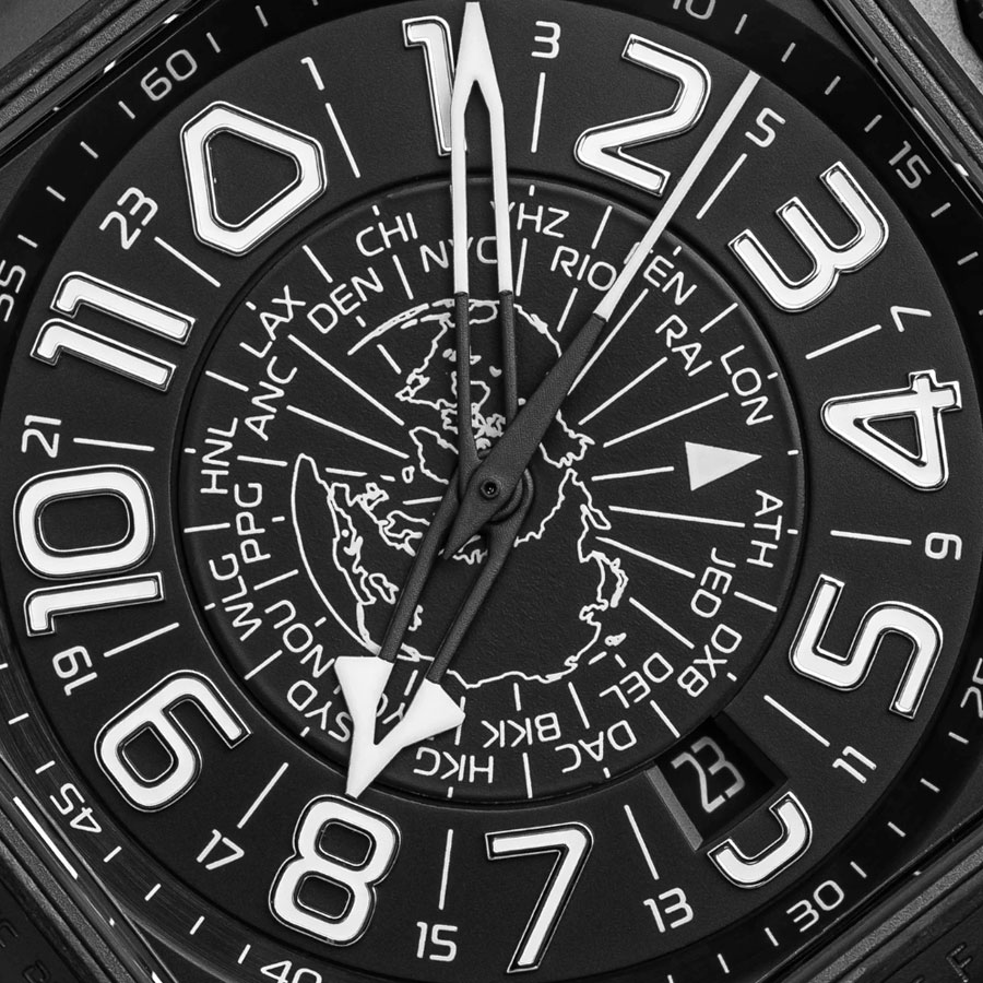 Côté mécanique, elle embarque le mouvement automatique japonais Miyota 9075, doté de la fonction True GMT, permettant de régler indépendamment l’heure locale et un second fuseau. Doté de 42 heures de réserve de marche, il confirme que sous son allure spatiale, la montre reste solidement ancrée dans la technique horlogère contemporaine.