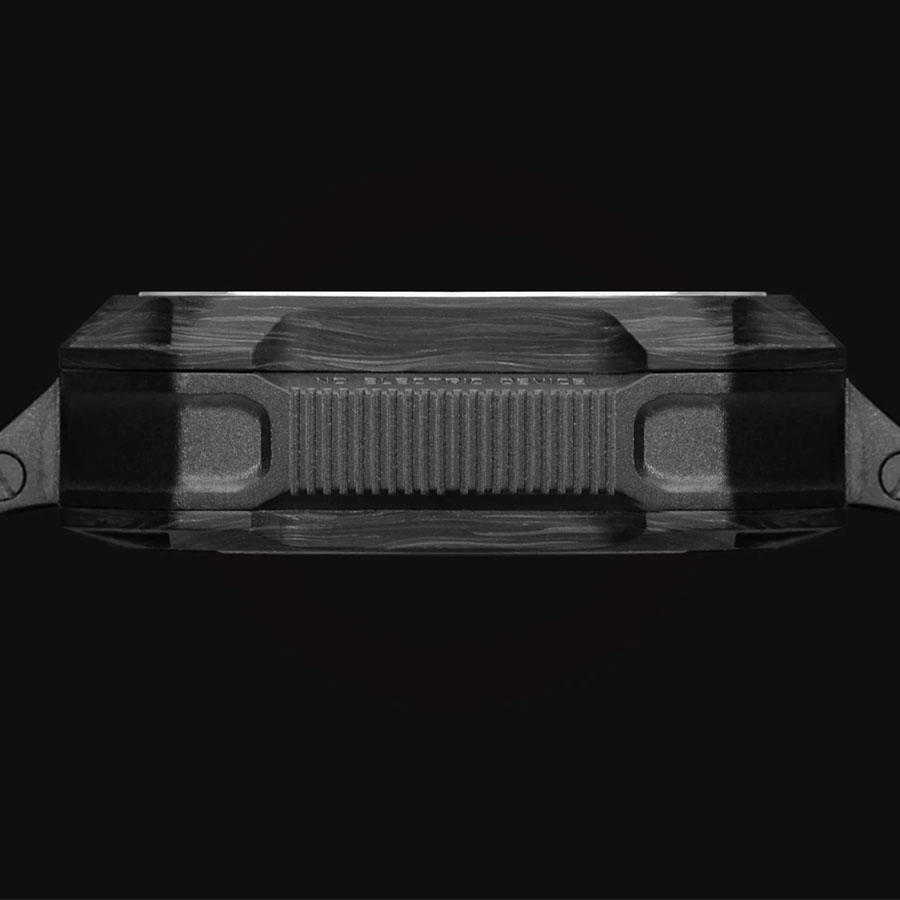 Le boîtier de 40 mm de diamètre est usiné en carbone forgé et en titane grade 2 traitement DLC gun metal de 13,30 mm d’épaisseur.