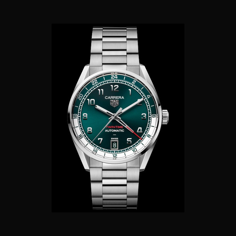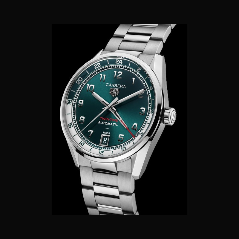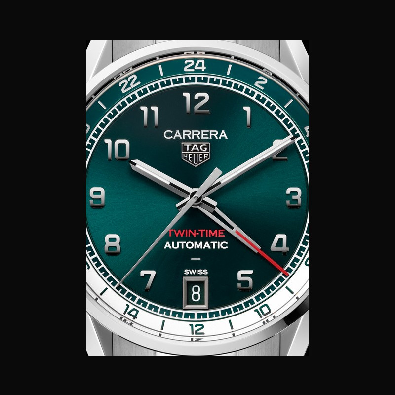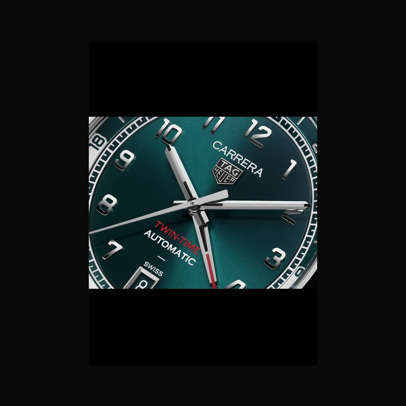 Affichage : | Rehaut vert sarcelle et argent avec échelle 24 heures Chiffres appliqués polis et facettés en plaqué rhodium Aiguilles des heures et des minutes polies et facettées en plaqué rhodium avec technologie Super-LumiNova® blanche Aiguille centrale polie et facettée en plaqué rhodium Aiguille GMT polie en plaqué rhodium avec extrémité laquée rouge Logo TAG Heuer appliqué et poli en plaqué rhodium Fenêtre de date à 6 heures Inscriptions “CARRERA” “TWIN-TIME” “AUTOMATIC” et “SWISS” imprimées |