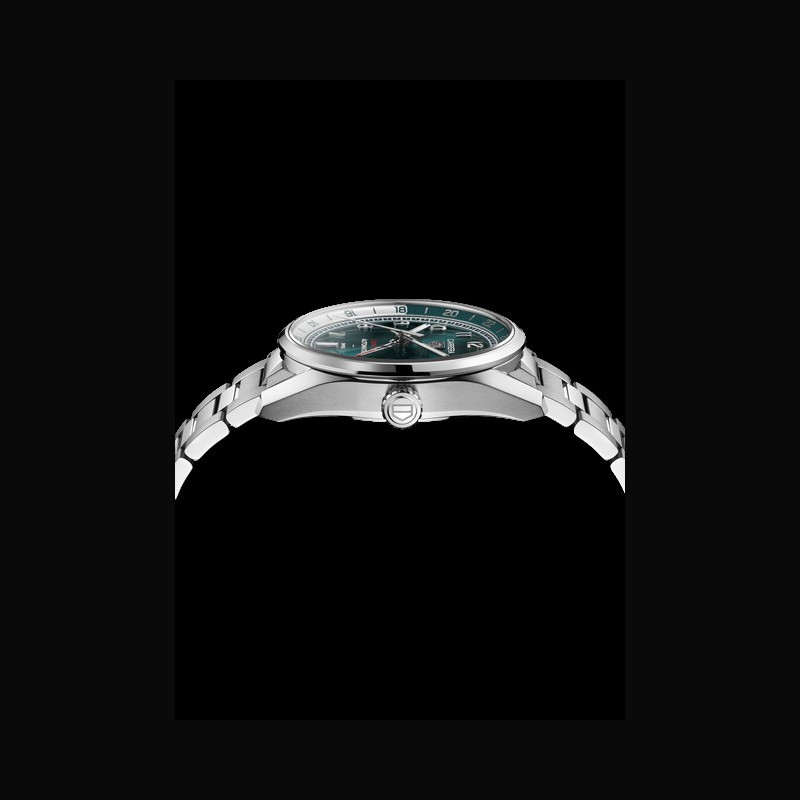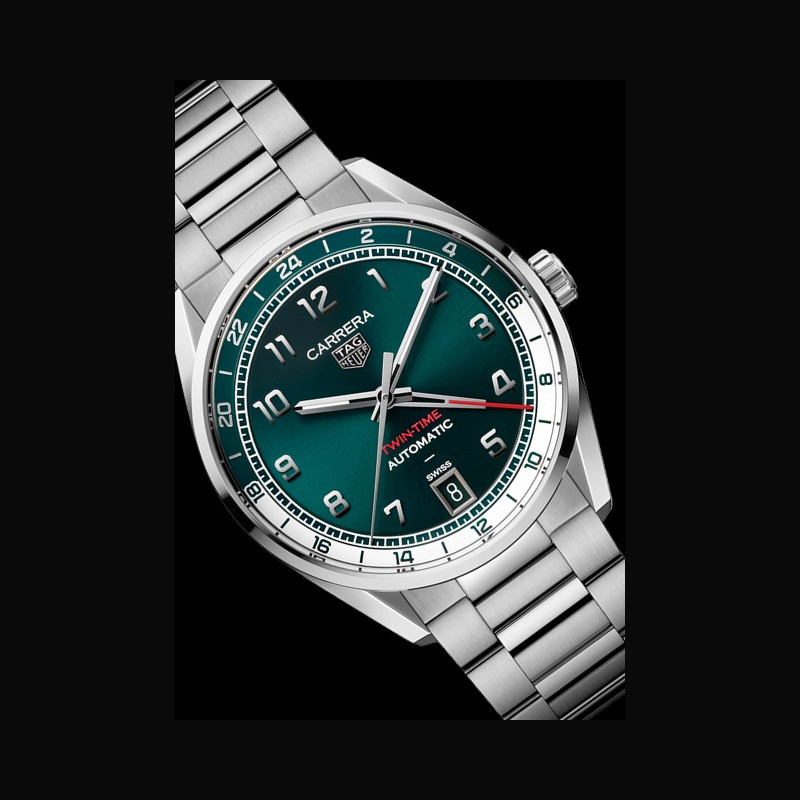 Au cœur de la collection se trouve une TAG Heuer Carrera Date Twin-Time remarquable. Son cadran brossé soleillé sarcelle, une nuance inspirée des combinaisons de course de l’âge d’or du sport automobile, est rehaussé d’un rehaut bicolore vert sarcelle et argent pour un effet visuel percutant. L’aiguille GMT à extrémité rouge, inspirée de sa consœur historique TAG Heuer Carrera GMT est un clin d’œil discret pour les passionnés, et sa forme évoque subtilement la précision des outils d’horlogerie tels que les pinces d’horloger. Associée aux chiffres arabes en plaqué rhodium, elle ajoute une touche de fonctionnalité pour une montre sophistiquée et pratique, parfaite pour les grands voyageurs.
