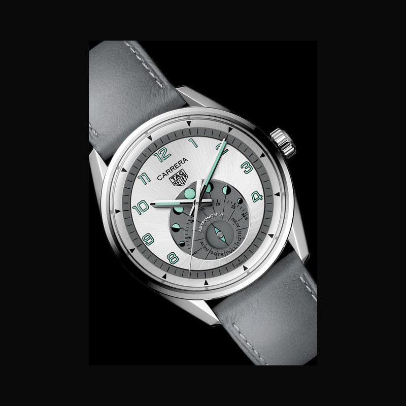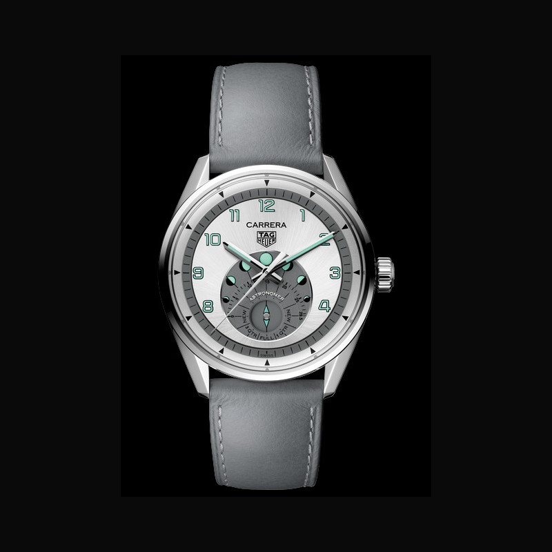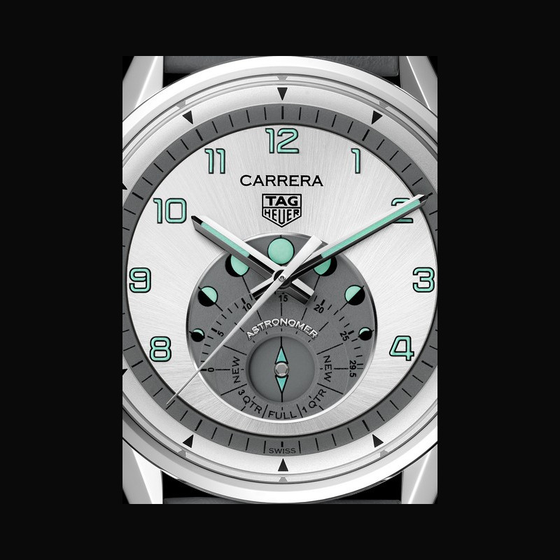 Au cœur de la TAG Heuer Carrera Astronomer réside le tout nouveau Calibre 7, un mouvement mécanique offrant une réserve de marche de 50 heures. Il alimente une complication phase de lune qui redéfinit la lecture des cycles lunaires. À 6 heures sur chaque cadran, un disque rotatif présente avec une grande précision sept phases lunaires illustrées. Mis en évidence par deux fines flèches calibrées pour un mouvement quotidien, le système affiche clairement la phase de la lune actuelle, ainsi que sa position dans le cycle de 29,5 jours.