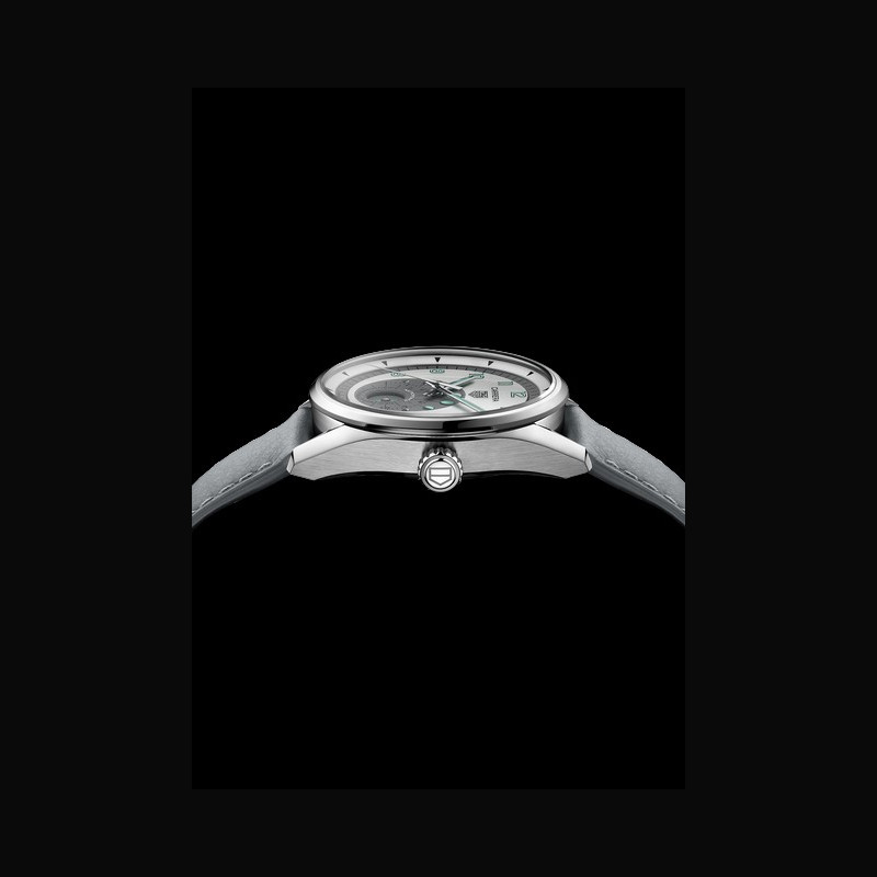 Le deuxième modèle, proposé en édition limitée à 500 exemplaires numérotés, introduit une touche de modernité grâce à ses contrastes visuels précis et ses détails raffinés. Le cadran argenté est rehaussé d’un rehaut gris foncé, mettant en valeur les détails turquoise de la montre, tous dotés de la technologie Super-LumiNova®. Ces éléments lumineux, visibles sur les chiffres arabes, les aiguilles et l’affichage des phases de la lune, confèrent à la montre un style futuriste et une énergie particulière. Ce modèle est accompagné d’un bracelet en cuir gris qui apporte à l’ensemble une élégance texturée et contemporaine.