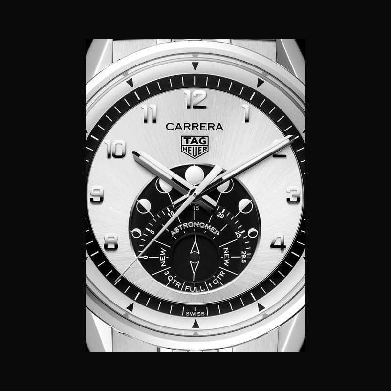 Au cœur de la TAG Heuer Carrera Astronomer réside le tout nouveau Calibre 7, un mouvement mécanique offrant une réserve de marche de 50 heures. Il alimente une complication phase de lune qui redéfinit la lecture des cycles lunaires. À 6 heures sur chaque cadran, un disque rotatif présente avec une grande précision sept phases lunaires illustrées. Mis en évidence par deux fines flèches calibrées pour un mouvement quotidien, le système affiche clairement la phase de la lune actuelle, ainsi que sa position dans le cycle de 29,5 jours.