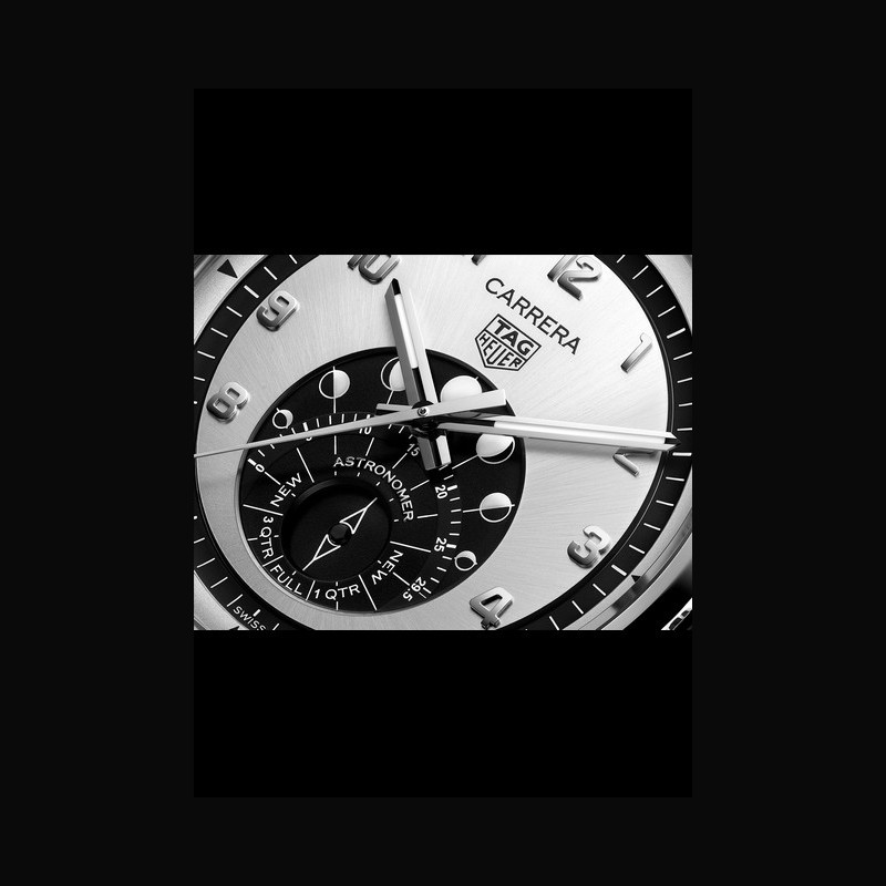 Affichage : | Rehaut noir et argenté avec échelle de 60 secondes / minute 1 compteur à 6 heures :disque rotatif central noir indiquant les phases de la lune Compteur extérieur finement grainé noir avec marquages des phases de la lune Logo "ASTRONOMER" indications des phases de la lune avec technologie Super-LumiNova® blanche en journée Chiffres appliqués et polis en plaqué rhodium Aiguilles des heures et des minutes polies et facettées en plaqué rhodium avec technologie Super-LumiNova® blanche en journée Aiguille centrale polie en plaqué rhodium Logo TAG HEUER noir imprimé Inscriptions "CARRERA" "ASTRONOMER" "SWISS" et phases de la lunes imprimées |
