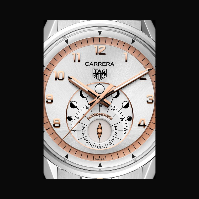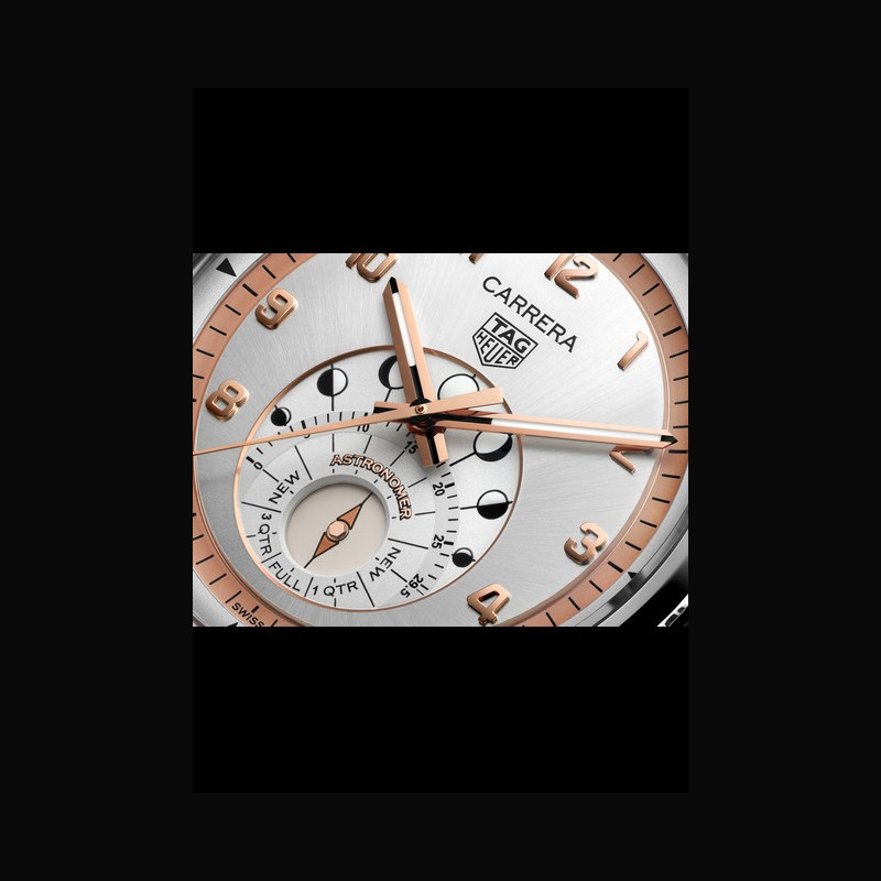 Affichage : | Rehaut argenté et plaqué or rose 18 carats 5N avec échelle de 60 secondes / minute 1 compteur à 6 heures : disque rotatif central argent indiquant les phases de la lune Compteur extérieur finement grainé argenté avec marquages des phases de la lune ; contour en plaqué or rose 18 carats 5N Chiffres appliqués et polis en plaqué or rose 18 carats 5N Aiguilles des heures et des minutes polies et facettées en plaqué or rose 18 carats 5N avec technologie Super-LumiNova® blanche Aiguille centrale polie en plaqué or rose 18 carats 5N Logo TAG HEUER noir imprimé Inscriptions "CARRERA" "ASTRONOMER" "SWISS" et phases de la lunes imprimées |
