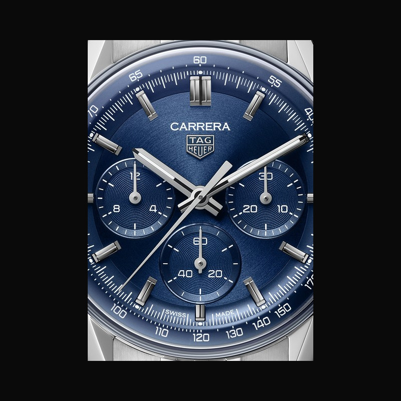| Affichage : | Rehaut bleu avec échelle tachymétrique de 60 secondes/minute blanche 3 compteurs : - 3 heures : chronographe des minutes avec "azurage" bleu ; aiguille polie en plaqué rhodium - 6 heures : indicateur permanent des secondes avec "azurage" bleu ; aiguille polie en plaqué rhodium - 9 heures : chronographe des heures avec "azurage" bleu ; aiguille polie en plaqué rhodium Index appliqués polis et facettés en plaqué rhodium Aiguilles des heures et des minutes polies et facettées en plaqué rhodium avec technologie Super-LumiNova® blanche Aiguille centrale polie en plaqué rhodium Logo TAG HEUER appliqué argenté Inscriptions CARRERA ; SWISS imprimées |