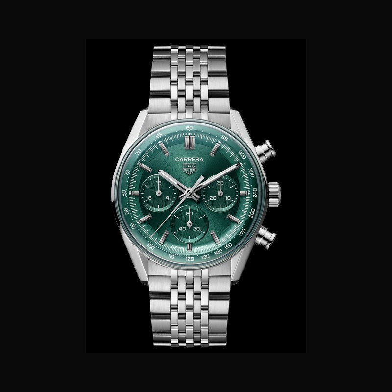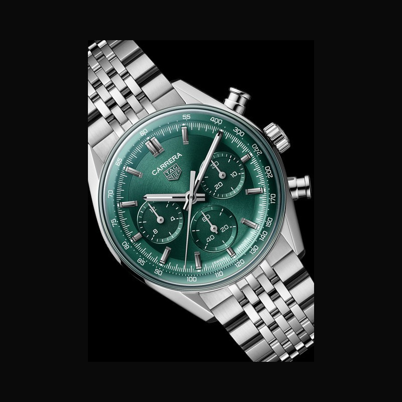 | Affichage : | Rehaut vert avec échelle tachymétrique de 60 secondes/minute blanche 3 compteurs : - 3 heures : chronographe des minutes avec "azurage" vert ; aiguille polie en plaqué rhodium - 6 heures : indicateur permanent des secondes avec "azurage" vert ; aiguille polie en plaqué rhodium - 9 heures : chronographe des heures avec "azurage" vert ; aiguille polie en plaqué rhodium Index appliqués ; polis et facettés en plaqué rhodium Aiguilles des heures et des minutes polies et facettées en plaqué rhodium avec technologie Super-LumiNova® blanche Aiguille centrale polie en plaqué rhodium Logo TAG HEUER appliqué argenté Inscriptions CARRERA ; SWISS imprimées |