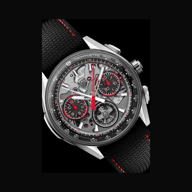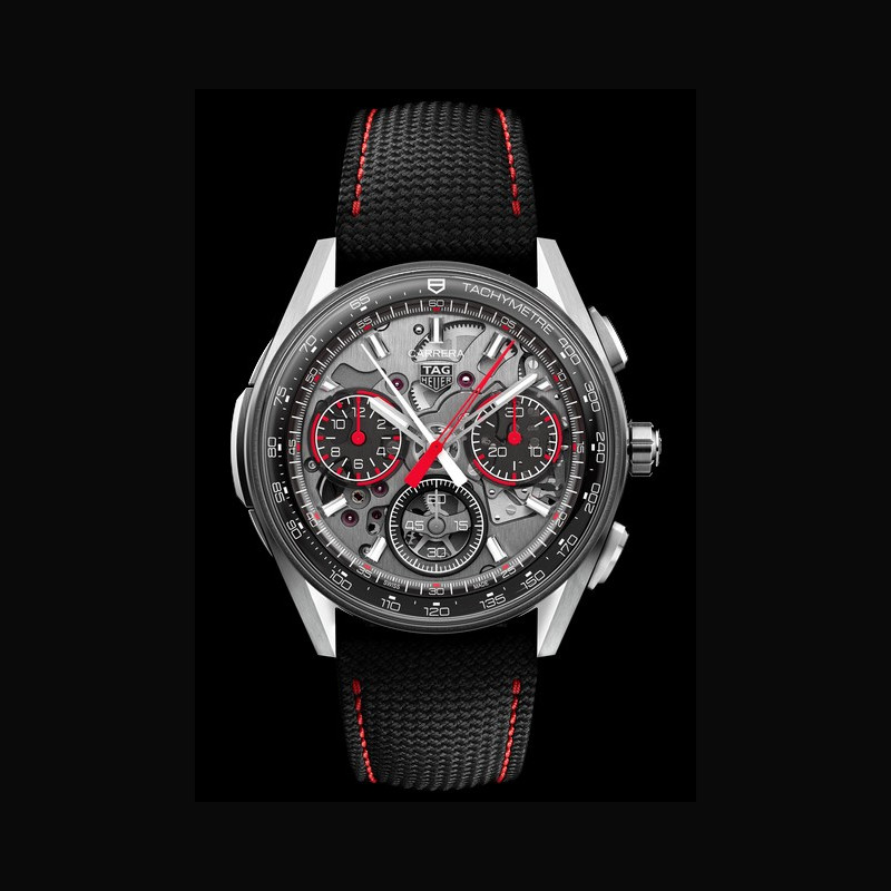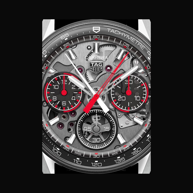 Le tachymètre sur le rehaut incurvé permet de suivre le profil du verre et de minimiser l’erreur de parallaxe, tandis que le verre saphir permet d’afficher les finitions du mouvement le rendant parfaitement visible. Reprenant le code de transparence clé pour les pièces d’horlogerie d’avant-garde TAG Heuer, les sous-cadrans sont réalisés séparément dans le même matériau que le cadran principal, ce qui confère un effet de profondeur à la montre.