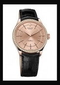 Les nouveaux modèles Cellini Time sertis sont proposés en or gris ou Everose 18 ct dans un boîtier de 39 mm de diamètre, paré d’une lunette simple ou double ornée de diamants. La double lunette combine une rangée de 96 diamants avec le cannelé emblématique des montres Rolex, assortie à un cadran laqué noir aux index prolongés de 11 diamants. Les versions avec lunette simple sertie de 62 diamants affichent de nouveaux cadrans, rose ou rhodium et décorés d’une finition soleil, avec des index en applique allongés. Les nouvelles Cellini Time serties se portent sur un bracelet en cuir alligator noir semi-mat, cousu et rembordé, assorti d'une boucle ardillon en or 18 ct de la couleur du boîtier.