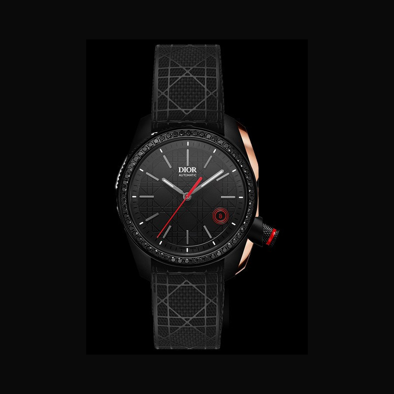 | Particularité du boitier : | Lunette sertie de diamants noirs (60.1.2ct) crantée entre 9h et 12h Bumper en or rose et couronne vissée rouge à 4 h |