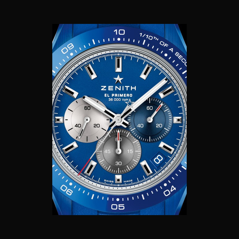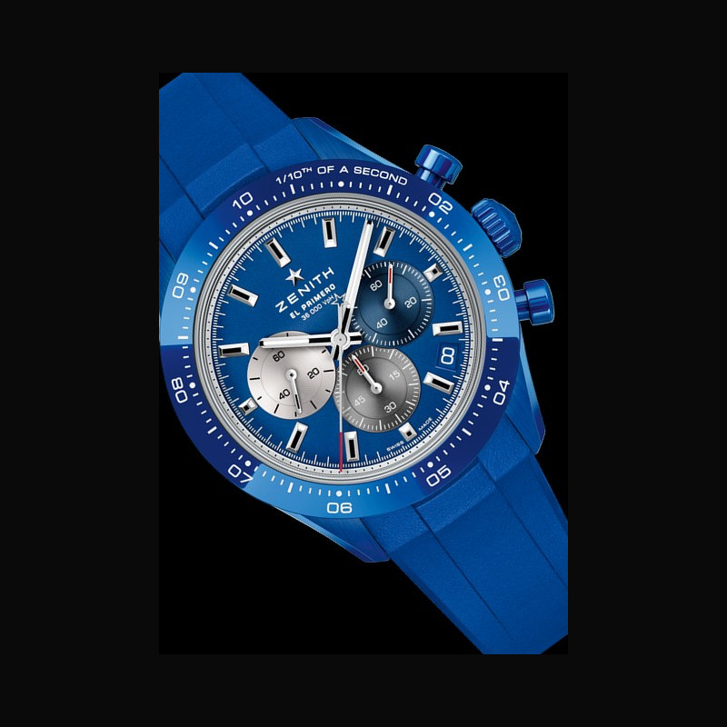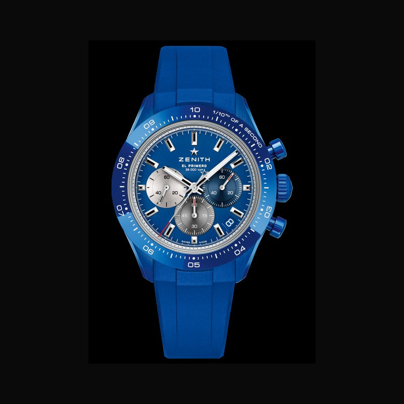 Plus de caractéristiques : | Mouvement Mouvement : El Primero 3600 automatique Fréquence : 36 000 A/h (5 Hz) Réserve de marche : environ 60 heures Boitier Céramique bleue Cadran Bleu soleillé avec trois compteurs de couleurs différentes Bracelet / Boucles Livrée avec 2 bracelets : bracelet en céramique bleue avec boucle déployante en céramique, et bracelet en caoutchouc bleu avec boucle déployante en acier |
