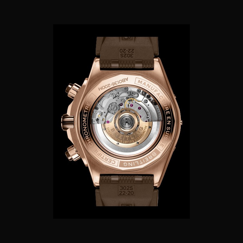 | + Plus de caractéristiques : | Mouvement Calibre Manufacture Breitling 01 Diamètre : 30 mm Epaisseur : 7,2 mm Remontage : mécanique à remontage automatique, bidirectionnel avec roulement à billes Réserve de marche : environ 70 heures Nombre de composants : 346 Alternance : 28 800 a/h ou 4 hertz Chronographe : roue à colonnes, embrayage vertical, ¼ de seconde Boitier Or rouge 18 carats Cadran Marron avec compteurs de chronographe argent contrastants Bracelet / Boucles Caoutchouc marron d’inspiration Rouleaux, fermé par une boucle déployante |