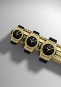 En écho à celle dessinée par Carlo Crocco : le bracelet en caoutchouc, la pureté du cadran noir laqué poli que seul le temps, incarné par les aiguilles facettées, vient distraire ; l’or jaune pour la version yellow gold et la signature de la Maison. À première vue semblable à l’original, le logo s’est affirmé avec les années, moderne et contemporain. Un passé conjugué au présent.